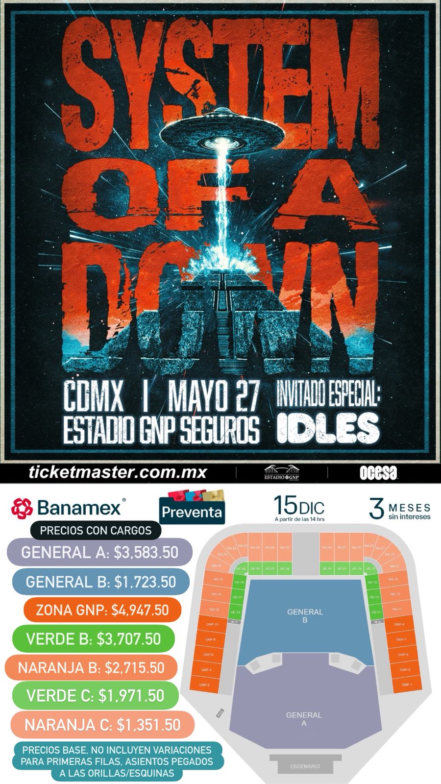 SYSTEM OF A DOWN 🤘🏽🎸 INVITADO ESPECIAL: IDLES 🗓️ Miércoles 27 de Mayo del 2026 🗓️ 🏟️ Estadio GNP Seguros 🏟️ 📍 CDMX📍 🇲🇽 México 🇲🇽